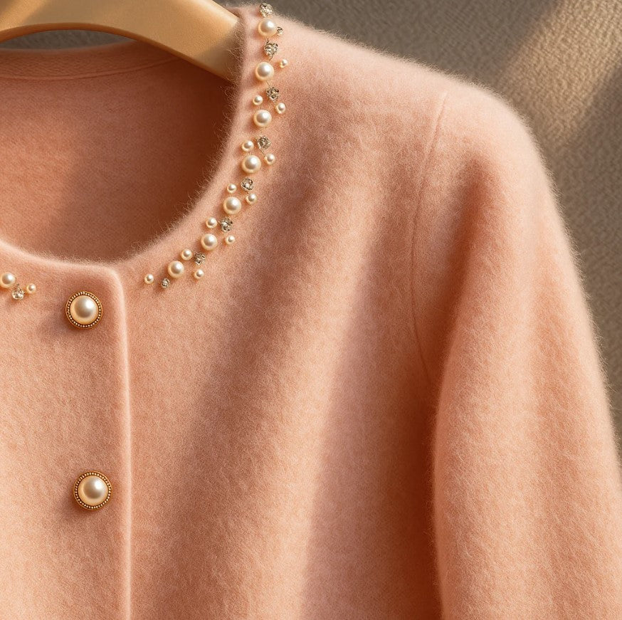 PAZ™ – Cárdigan de Cachemira Mongola con Perlas Akoya y Puños de Piel